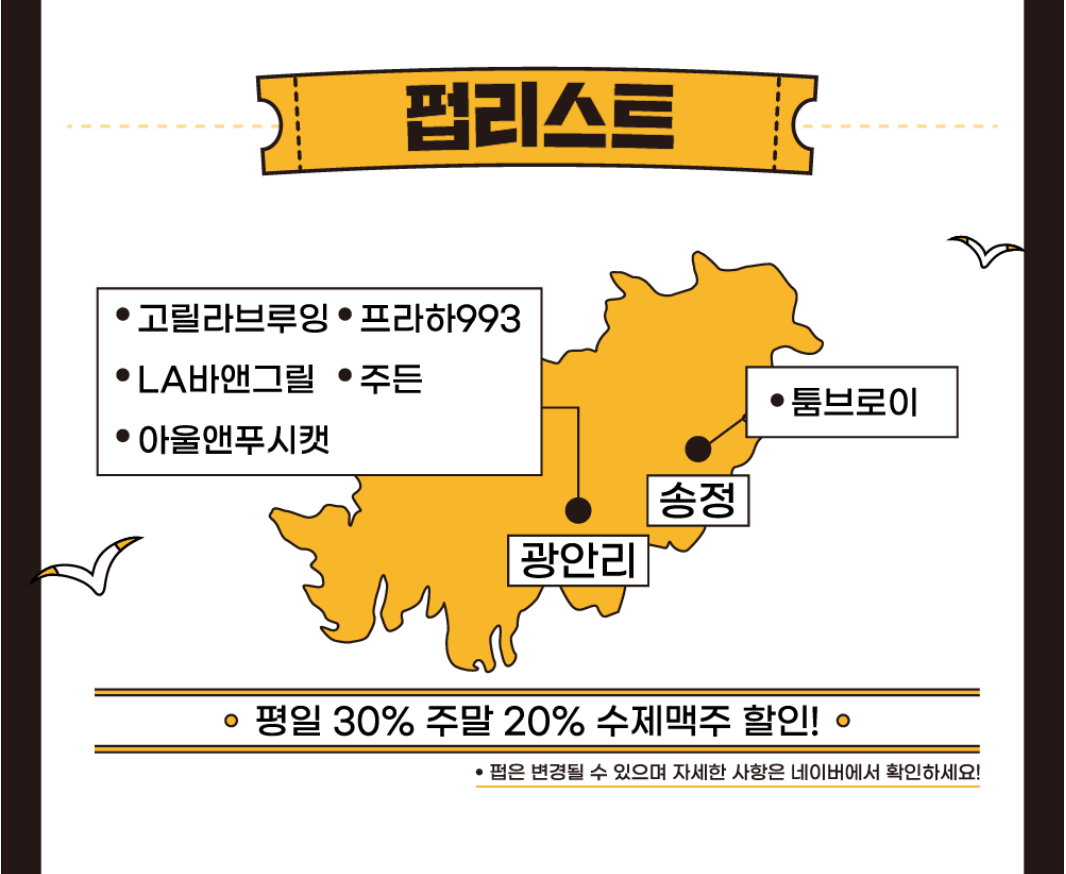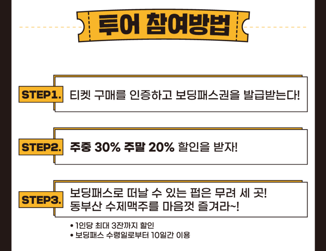 '맥주 덕후'라면 여기 주목! 동부산을 대표하는 수제맥주 펍이 모였다! 동부산 권역에 모인 펍을 돌아다니며 다양한 수제맥주를 정복해보세요. 브루어리탐험대가 되었음을 확인하는 '보딩패스'